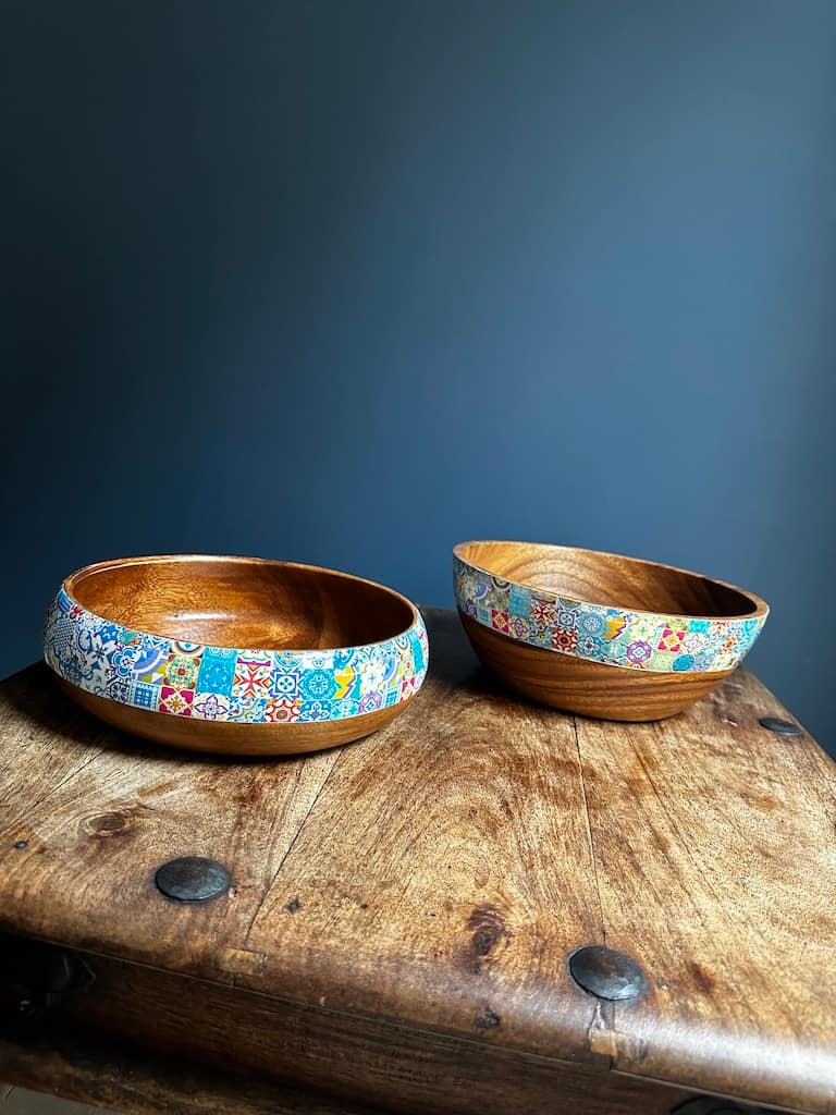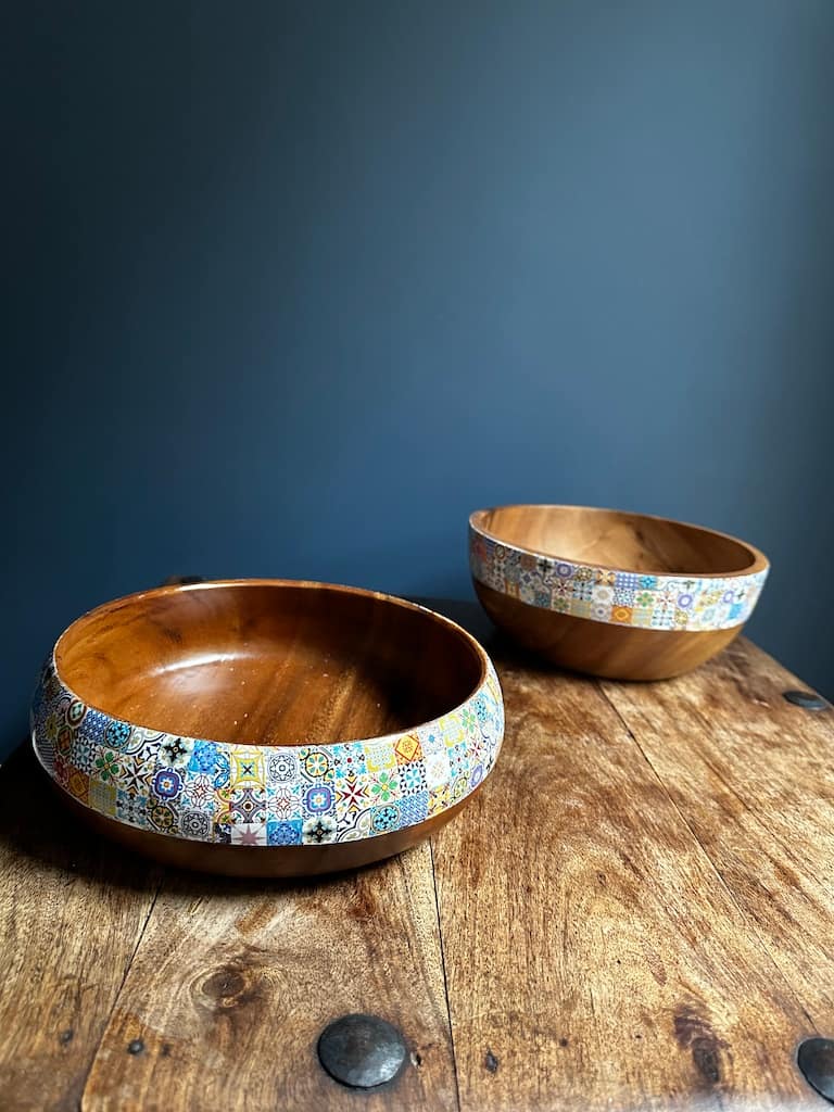 Bright Blue Mix tile painted effect Acacia Wood Square Bowl H9 x W26 x D26cm approx