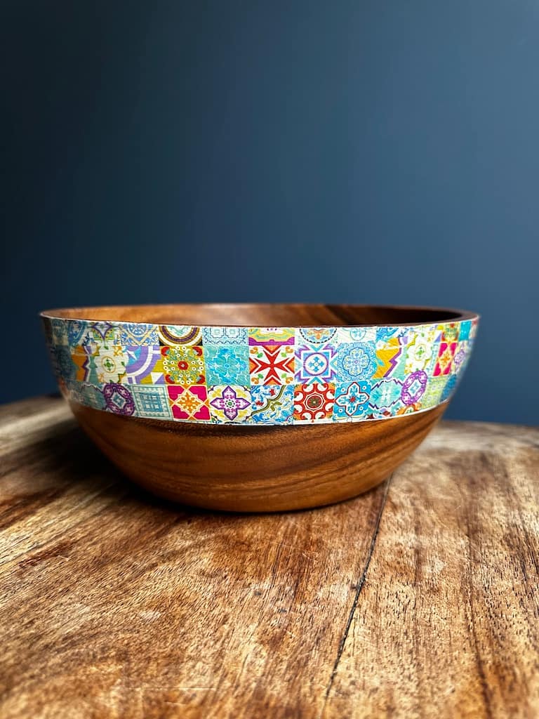 Adding a touch of contemporary style to a kitchen is this unique popular tile designed wood bowl. Made from Acacia wood, this bowl features beautiful swirling grains on its surface which is thoroughly milled to produce a smooth texture. The pattern is applied and sealed making it waterproof but not scratch-proof. Its round shape and generous size is ideal for serving snacks and nibbles to guests making it a true bespoke centre-piece in your home.