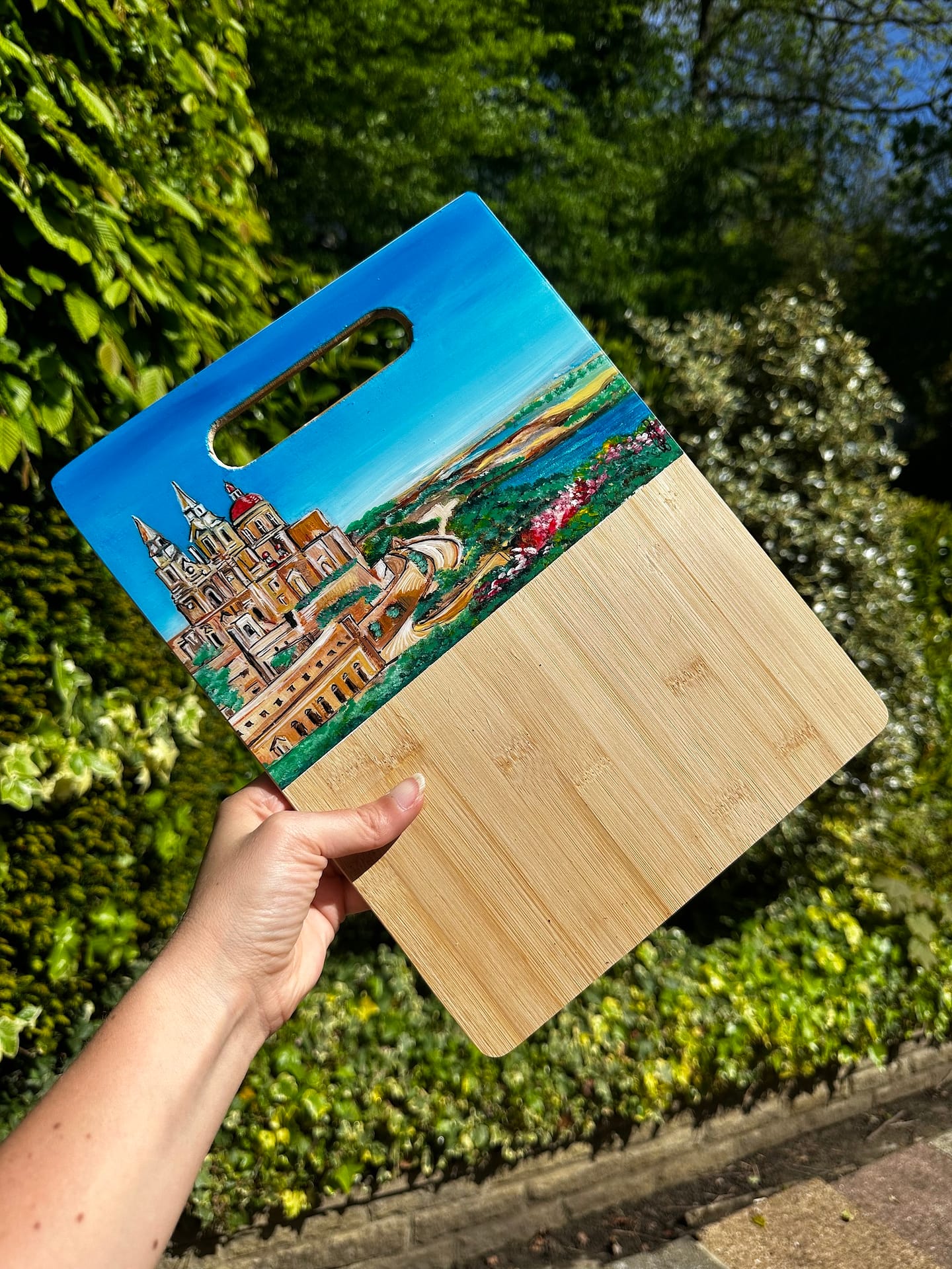 Unique hand crafted slim bamboo charcuterie board in this unique hand painted Mellieha Church design. Present a selection of bread, cheese, antipasti, and tapas, on this striking unique handcrafted serving board. The shape of this slim board simple enough to let the natural beauty of the wood shine. The rectangular sleek look of this board and the practical handle is perfect for displaying and hanging your bespoke design in your home as well as adding a touch of class to your decor.