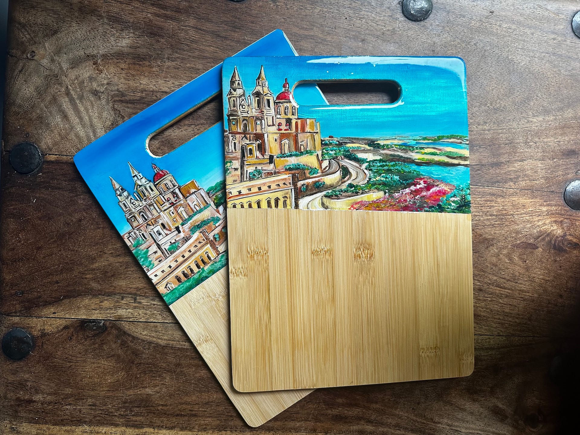 Painted Hand Painted Mellieha Church Malta Charcuterie Bamboo Slim Wood Board 30.5x23x1 cm