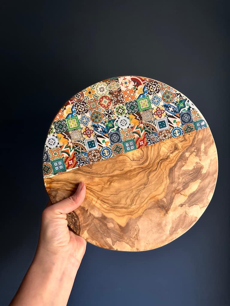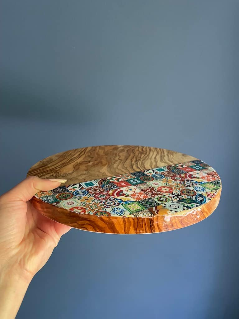 * Resin can scratch, do not cut on the design area, do not use abrasive cleaners and drag on highly abrasive surfaces.