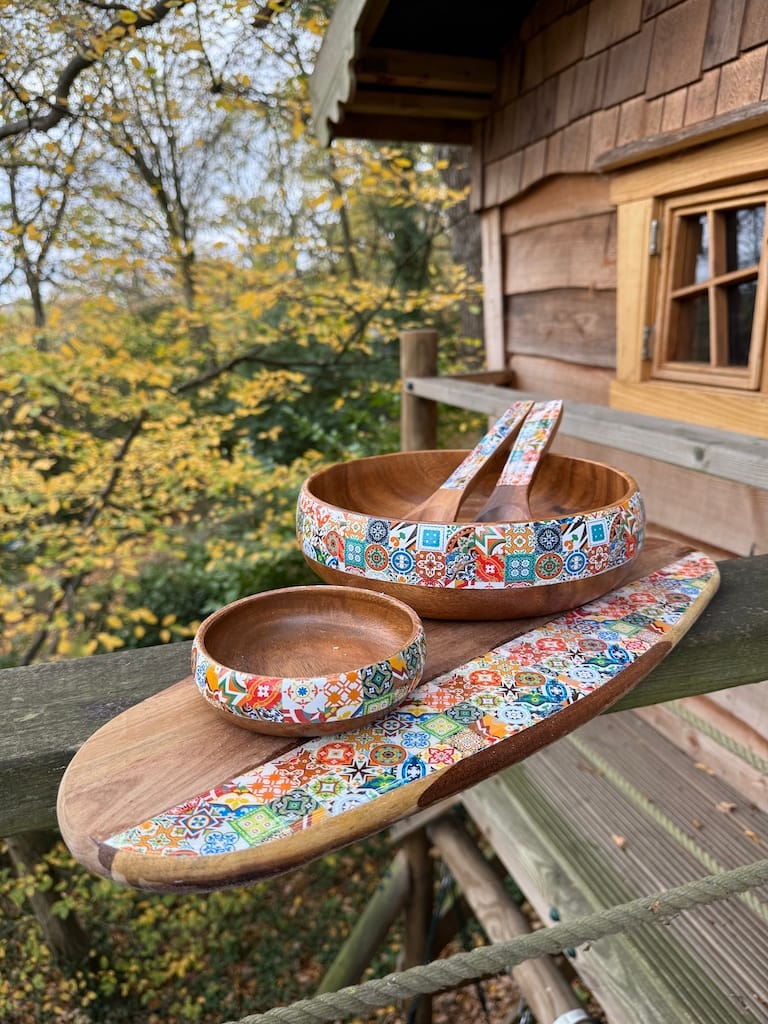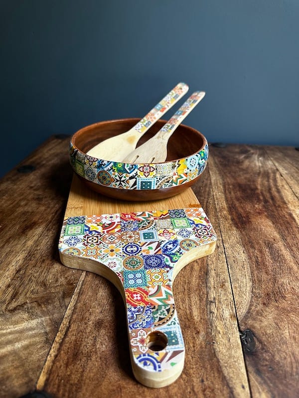Adding a touch of contemporary style to a kitchen is this unique popular tile designed wood set. Made from Acacia wood, this bowl features beautiful swirling grains on its surface which is thoroughly milled to produce a smooth texture. The pattern is applied and sealed making it waterproof but not scratch-proof. Its round shape and generous size is ideal for serving snacks and nibbles to guests making it a true bespoke centre-piece in your home. Also with the bowl is a lovely set of Bamboo wood utensils and a slim bamboo board.