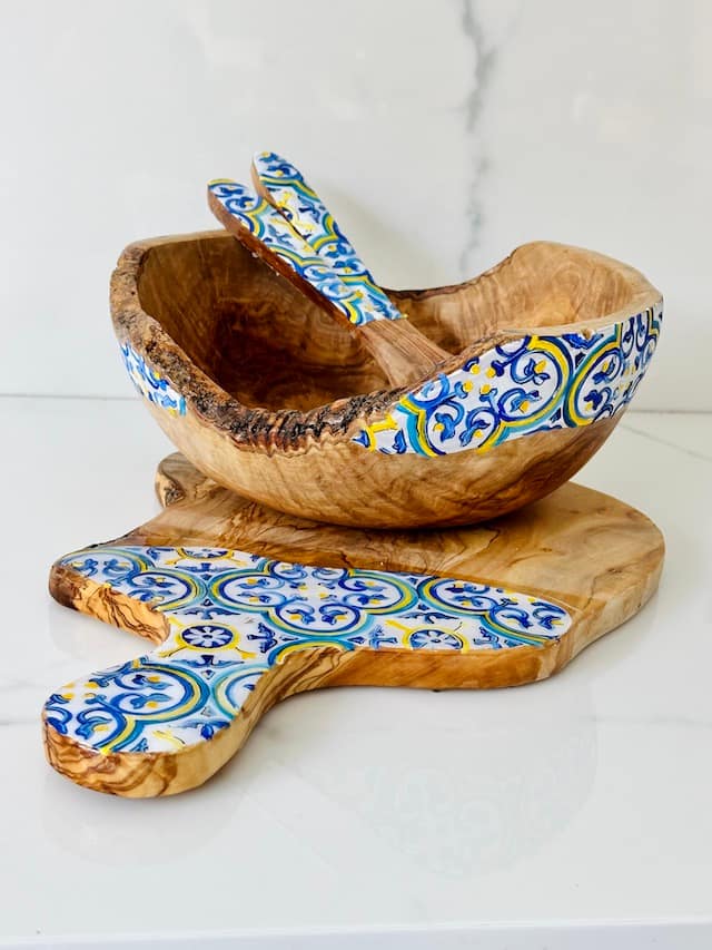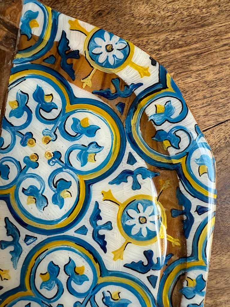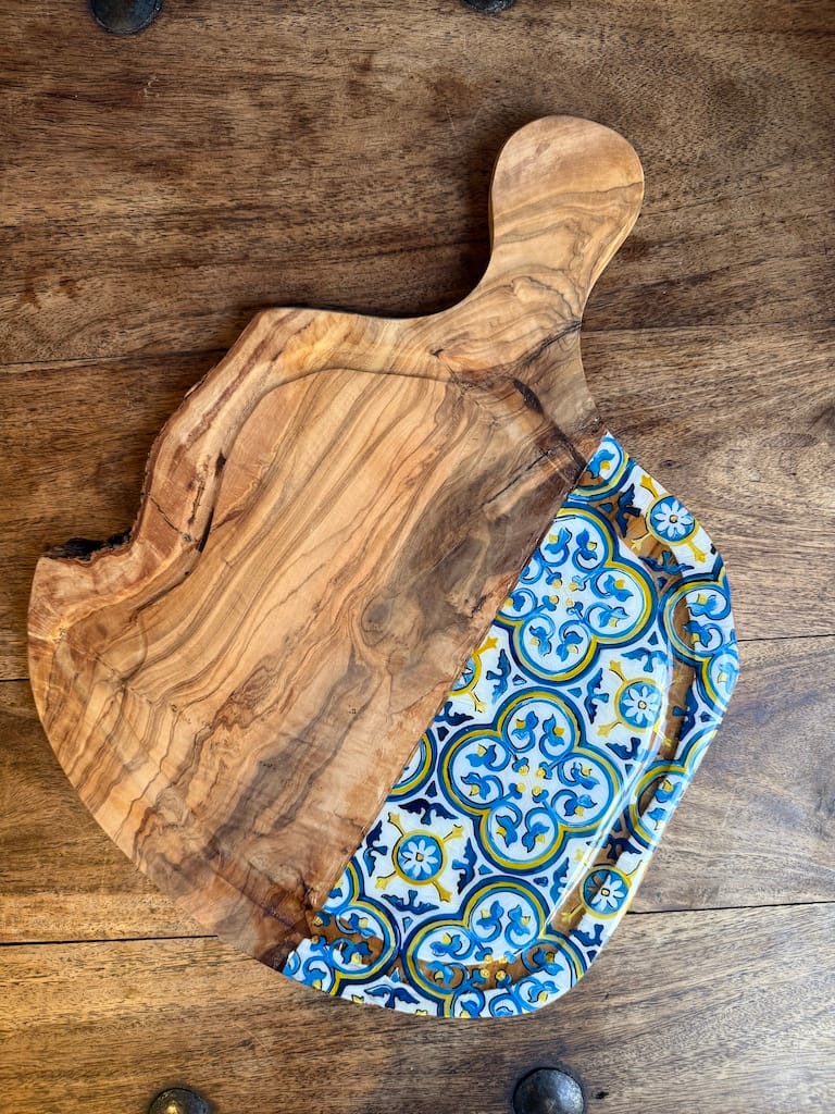 Nanna Blue Hand Painted Maltese Traditional Tile Handle Charcuterie Olive Wood Board 40 cm