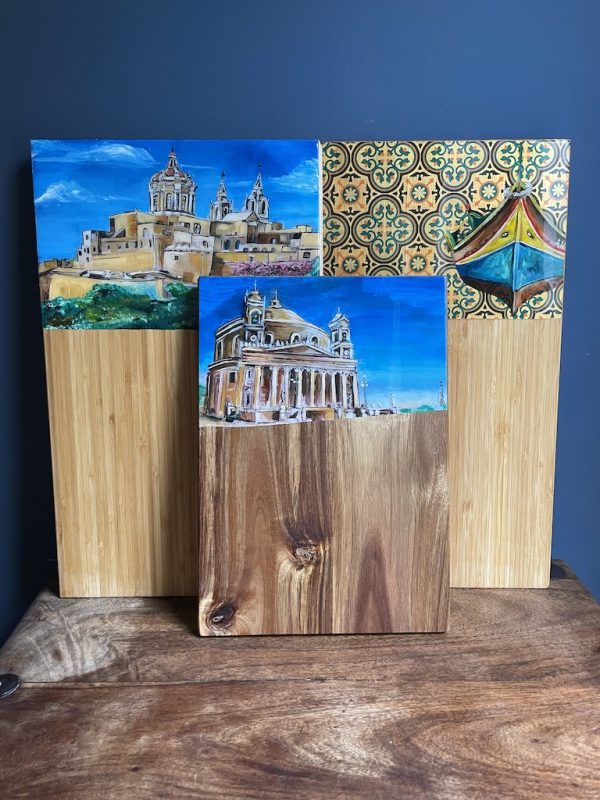 One off! Unique charcuterie board in Bonnymia’s hand painted Luzzu with an added unique copper leaf background and a tile pattern. Present a selection of bread, cheese, antipasti, and tapas, on this striking unique handcrafted serving board. The shape of this board is also both practical to hold and simple enough to let the natural beauty of the wood shine. The rectangular sleek look of this board and the beautiful grain of wood is perfect for displaying your bespoke design in your home as well as adding a touch of class to your decor.