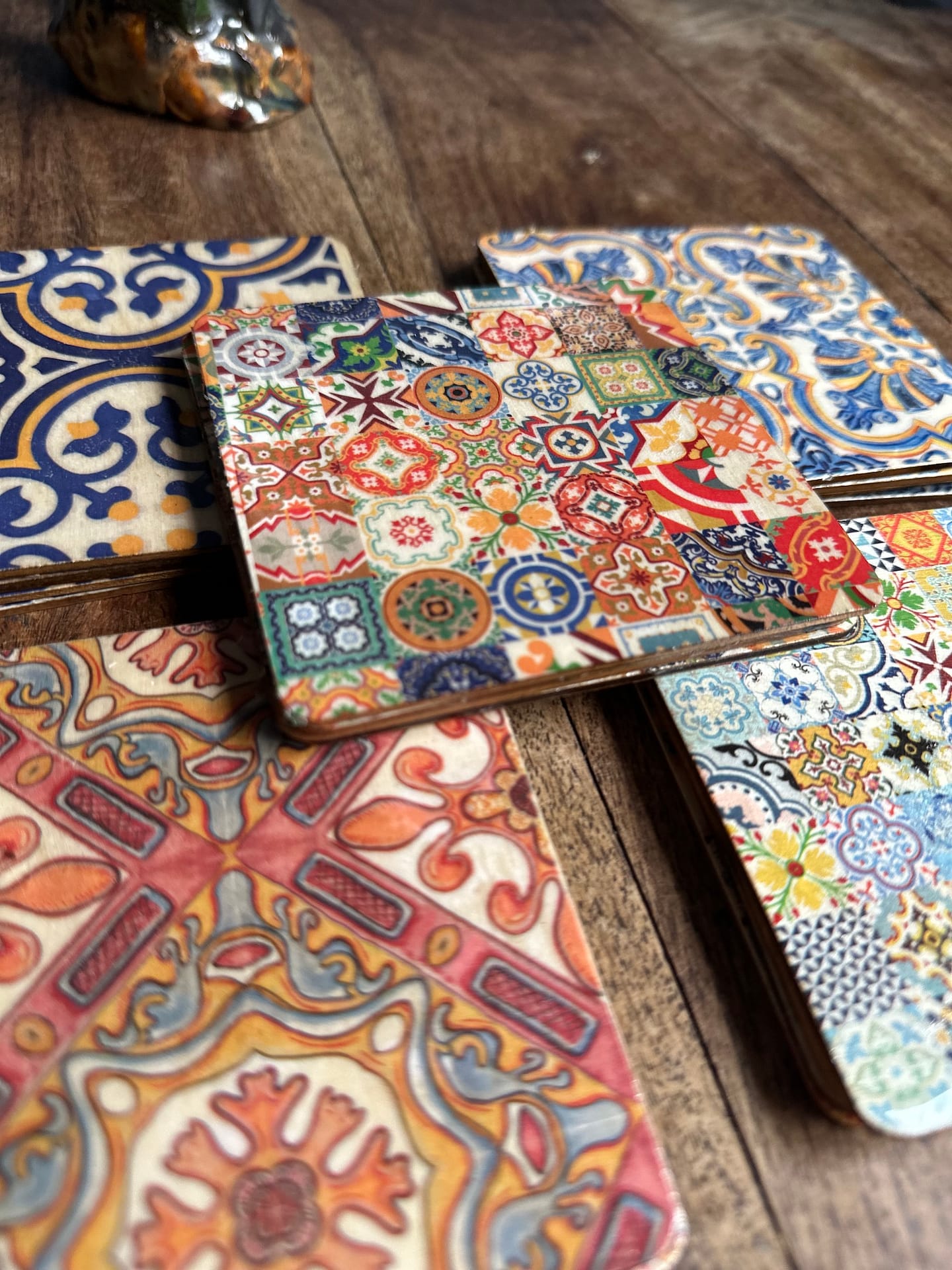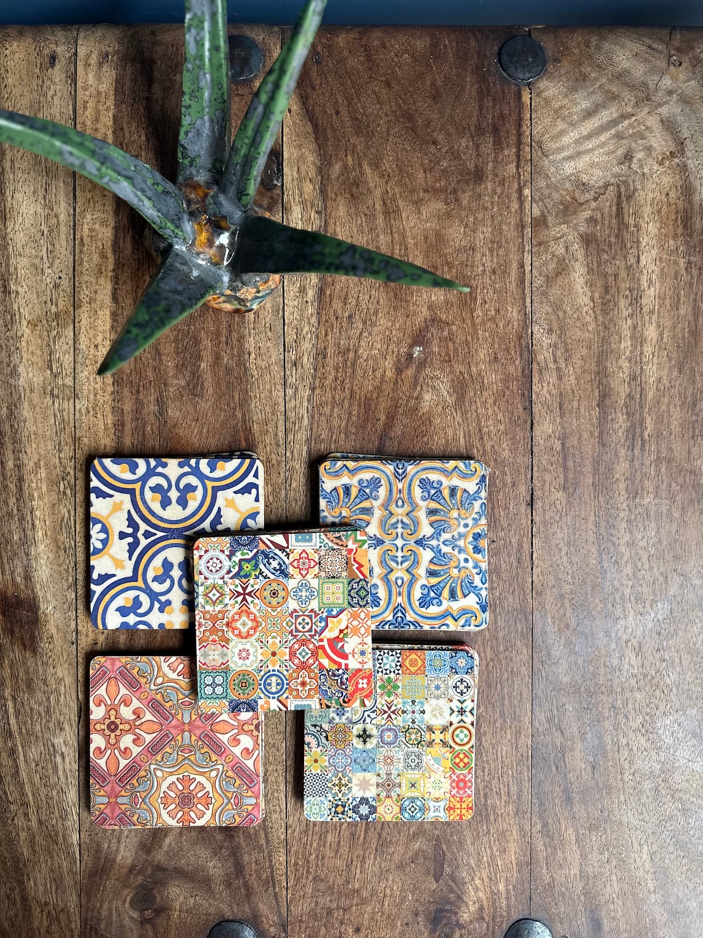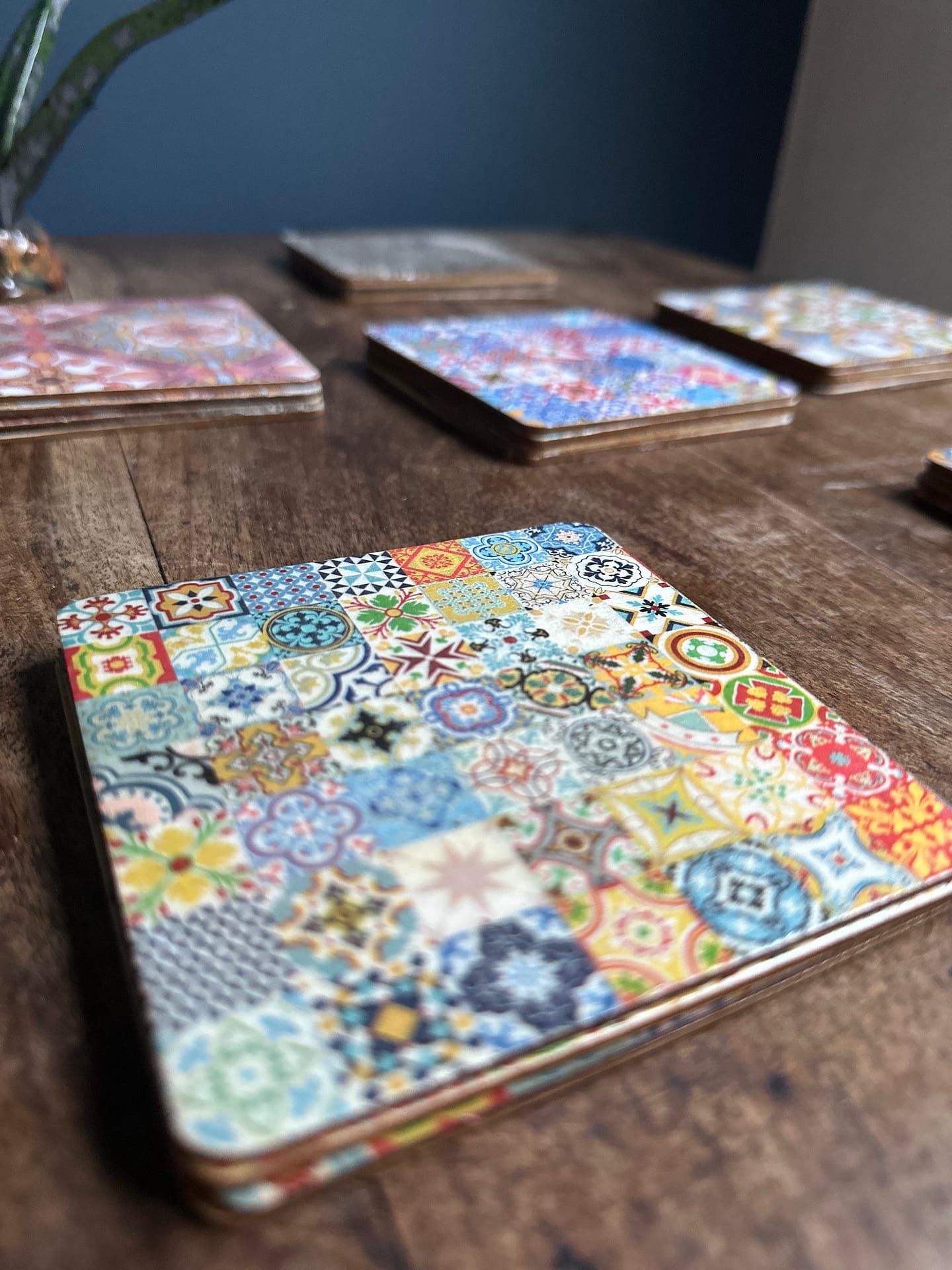 New Mix Tile Painted Effect Slim Natural Wood Square Coasters Set of 4