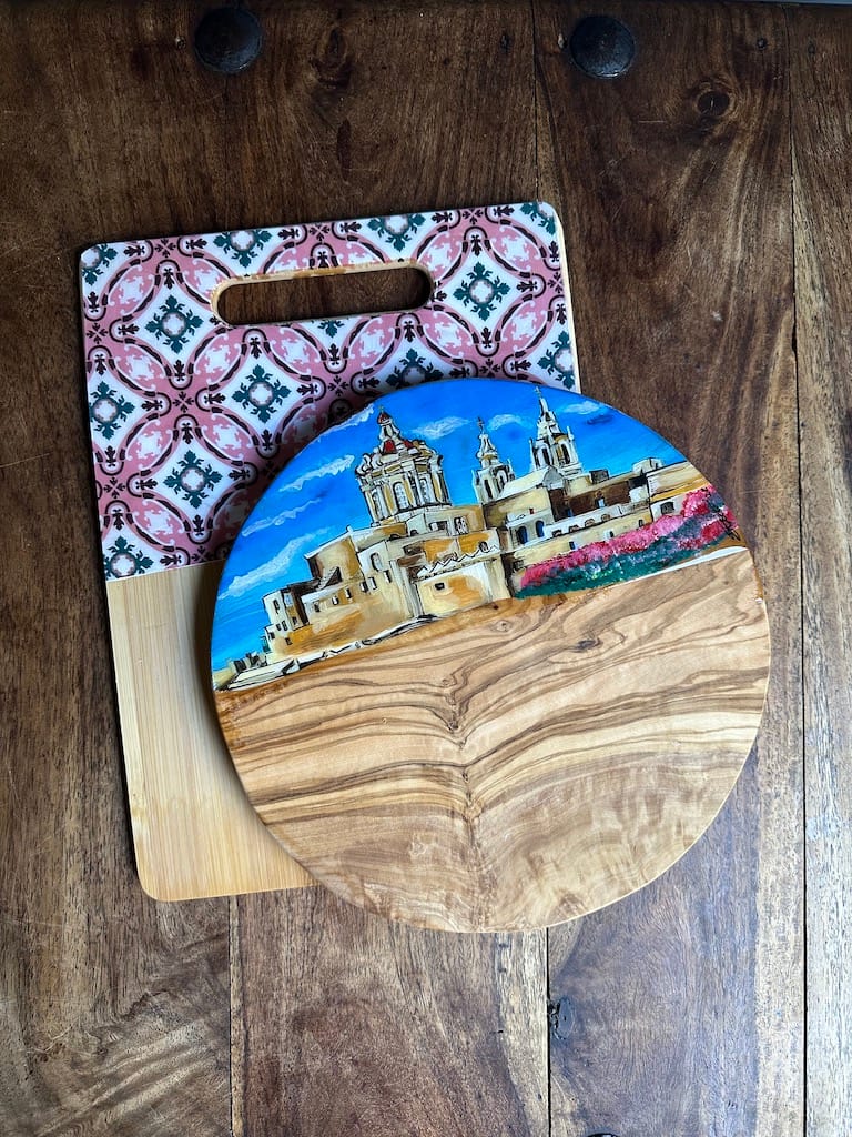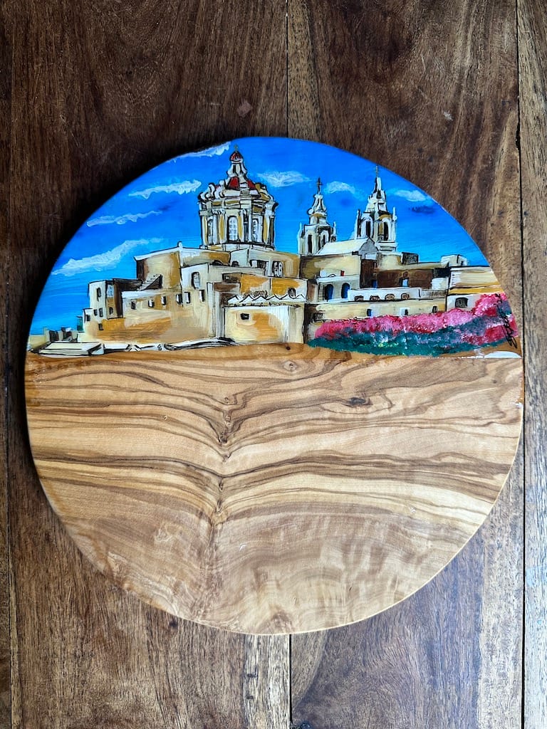 Adding a touch of contemporary style to a kitchen, unique hand painted charcuterie board in Mdina, Malta design also known as the “Silent City”.