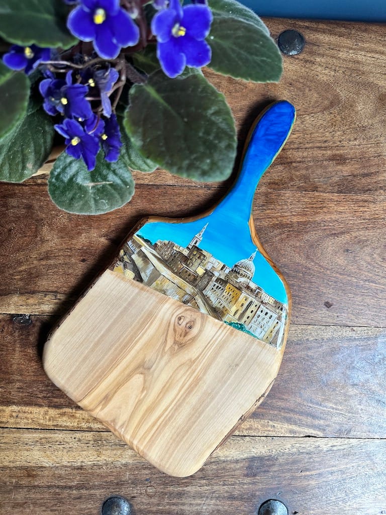 Adding a touch of contemporary style to a kitchen, unique hand painted charcuterie board featuring the iconic view of Valletta, Malta design. This premium quality olive wood charcuterie board has been hand painted by me and handcrafted in Malta. The beautiful grain of olive wood follows the tortuous way the trees grow. It is hard wearing and with a little care will last a lifetime. Added to this it has natural anti-bacterial properties. Unique hand crafted charcuterie olive wood board in Painted design. Present a selection of bread, cheese, antipasti, and tapas, on this striking unique handcrafted serving board. The shape of this board is also both practical to hold and simple enough to let the natural beauty of the wood shine.