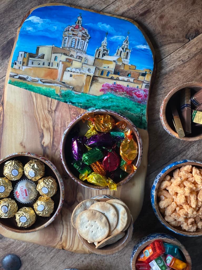 Adding a touch of contemporary style to a kitchen, unique hand painted charcuterie board featuring the iconic view of Valletta, Malta design. This premium quality olive wood charcuterie board has been hand painted by me and handcrafted in Malta. The beautiful grain of olive wood follows the tortuous way the trees grow. It is hard wearing and with a little care will last a lifetime. Added to this it has natural anti-bacterial properties. Unique hand crafted charcuterie olive wood board in Painted design. Present a selection of bread, cheese, antipasti, and tapas, on this striking unique handcrafted serving board. The shape of this board is also both practical to hold and simple enough to let the natural beauty of the wood shine.