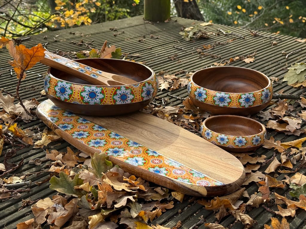 Adding a touch of contemporary style to a kitchen is this tile designed wood bowl. Made from Acacia wood, this bowl features beautiful swirling grains on its surface which is thoroughly milled to produce a smooth texture. The pattern is applied and sealed making it waterproof but not scratch-proof. Its round shape and generous size is ideal for serving snacks and nibbles to guests making it a true bespoke centre-piece in your home.