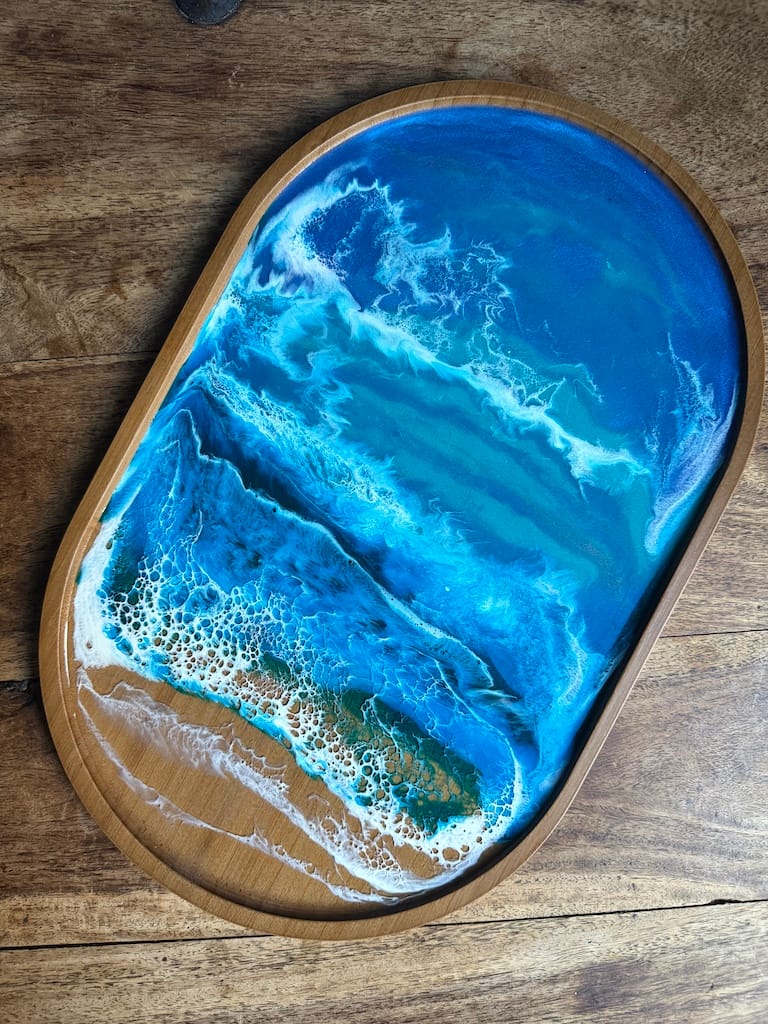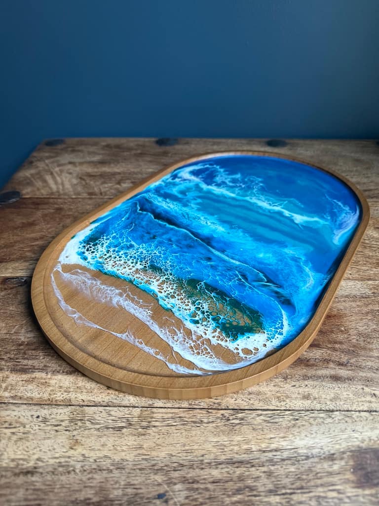 Unique hand crafted iridescent charcuterie tray in this incredible Blue wave finish wood board. Present a selection of bread, cheese, antipasti, and tapas, on this striking unique handcrafted tray. This wooden tray can also be used to serve, champagne, tea and biscuits thanks to it angled edge. The oval look of this tray is perfect for displaying your bespoke design in your home as well as adding a touch of class to your decor.